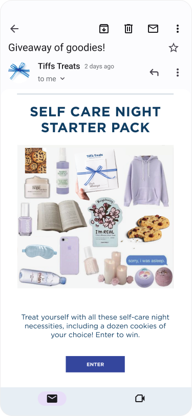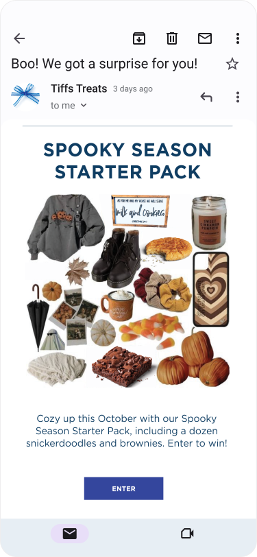 Idea: We share our seasonal recommendations in a collage inspired by the UGC-style ‘starter pack’ posts popular across socials. Then, we do a giveaway with those items for our followers, including some sweet treats of course! These “Guide to the Season” emails can an be continued for any regular season (e.g. summer, Back-To-School, winder holidays season). Also applicable for social.