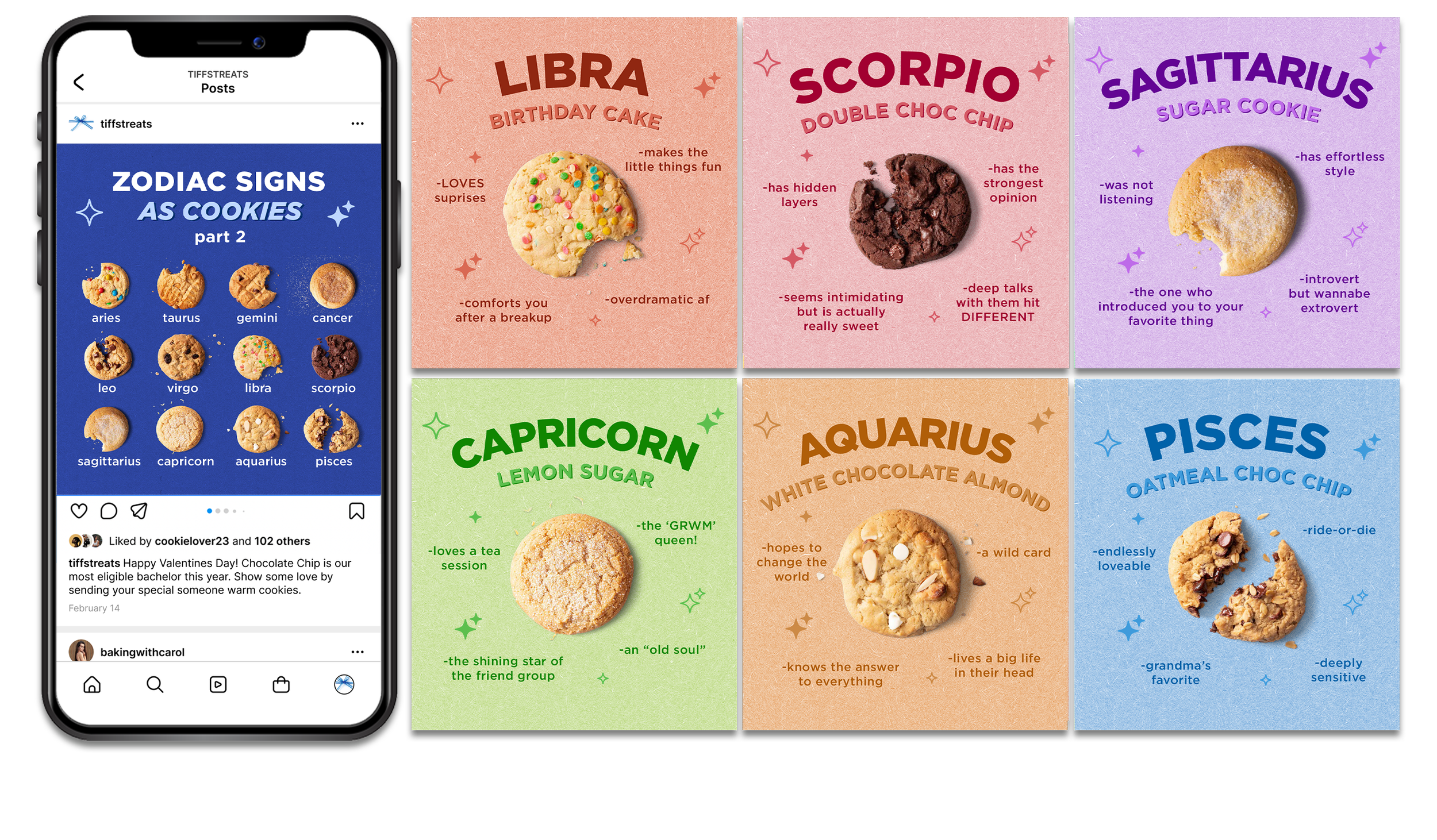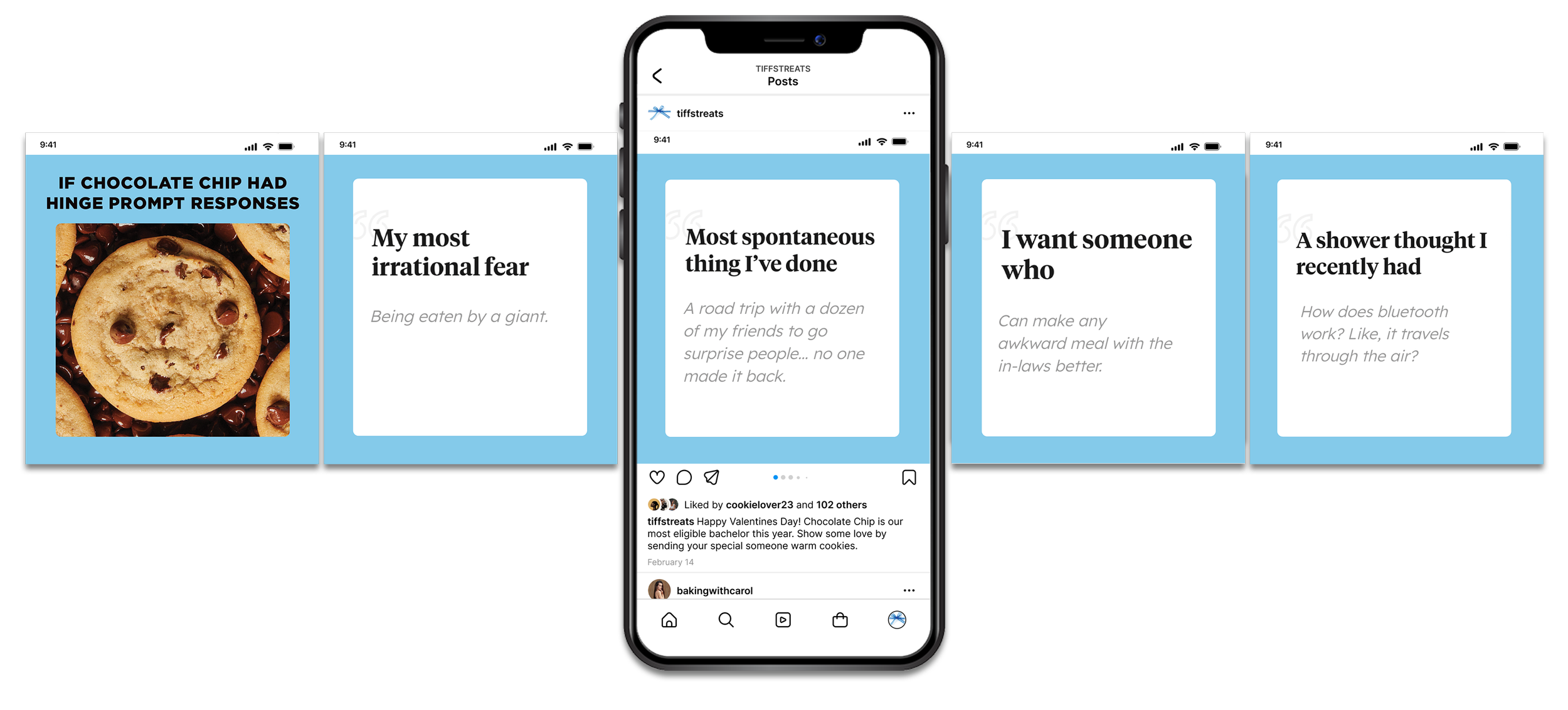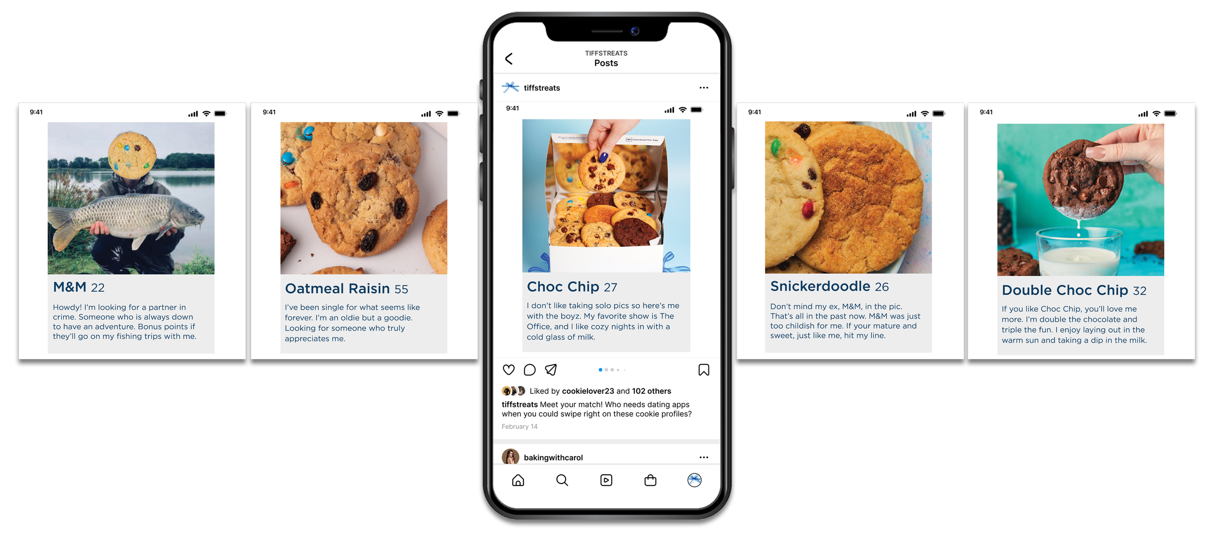 Idea: The Tiff’s Mix cookies if they had Tinder profiles. Each bio’s personality is inspired by the cookie’s flavor, while poking fun at dating app clichés.