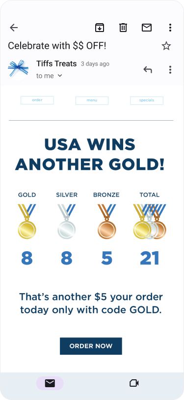 Idea: Tiff’s is promoting the Olympics as an Occasion on the site to buy the Red, White and Blue cookie. Every time the USA wins a gold medal, Tiff’s discounts orders by $5 with code GOLD systemwide.